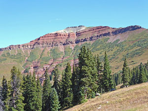 At 3.9 miles the ascent ends as the trail starts a traverse along the western slopes of Jura Knob’s south ridge. Ahead great views open to the multi-colored south face of Jura Knob and Peak 12,766-ft. at the head of the Engine Creek Valley. The Rolling Mountain massif (13,693-ft.) dominates the view in the distance.